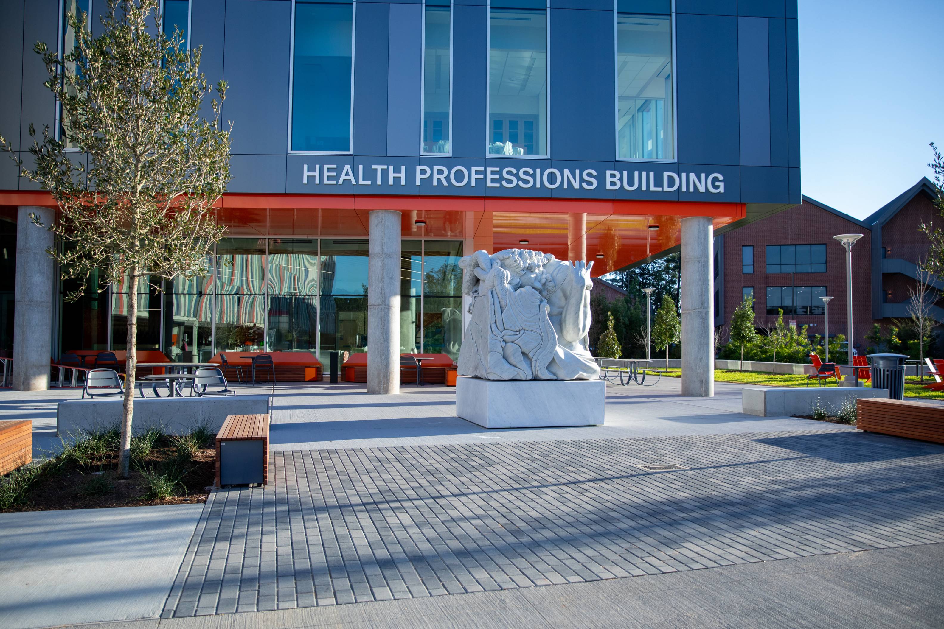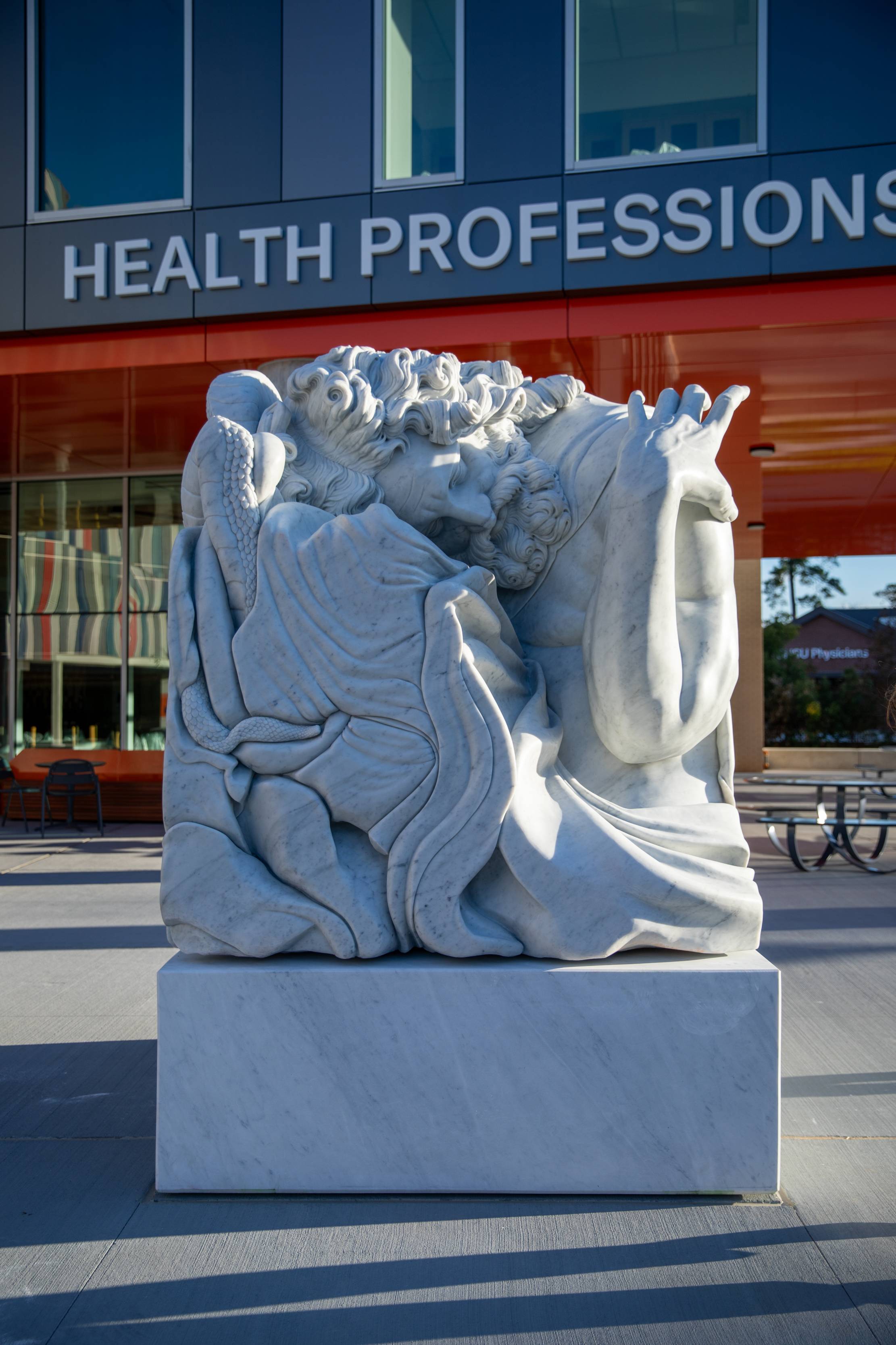 Adam Parker Smith’s marble sculpture at the entrance to Sam Houston State University at Conroe’s Health Professions Building presents Asclepius, the ancient Greek god of medicine. The sculpture depicts Asclepius condensed into a dense cubic form, inviting the viewer to reconsider the reverence we place on classical ideals. This reinterpretation also parallels the evolution of medical knowledge over the centuries, as vast bodies of information have been condensed and adapted into modern medical practice.